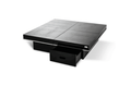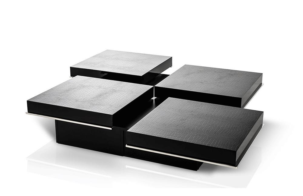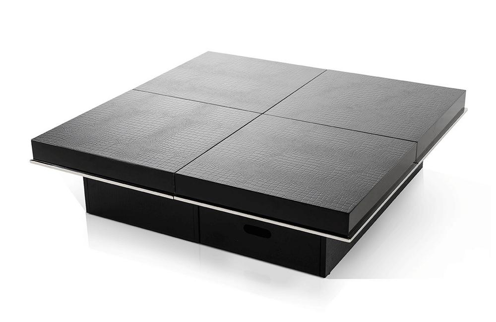 This ambulatory design includes four extendable squares that comprise the table top and one pull out drawer. Other features include a detailed laser-cut crocodile textured surface finished in a Black gloss and stainless steel trim around the top edges of the table top. Available with the option of crocodile texture in white.