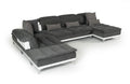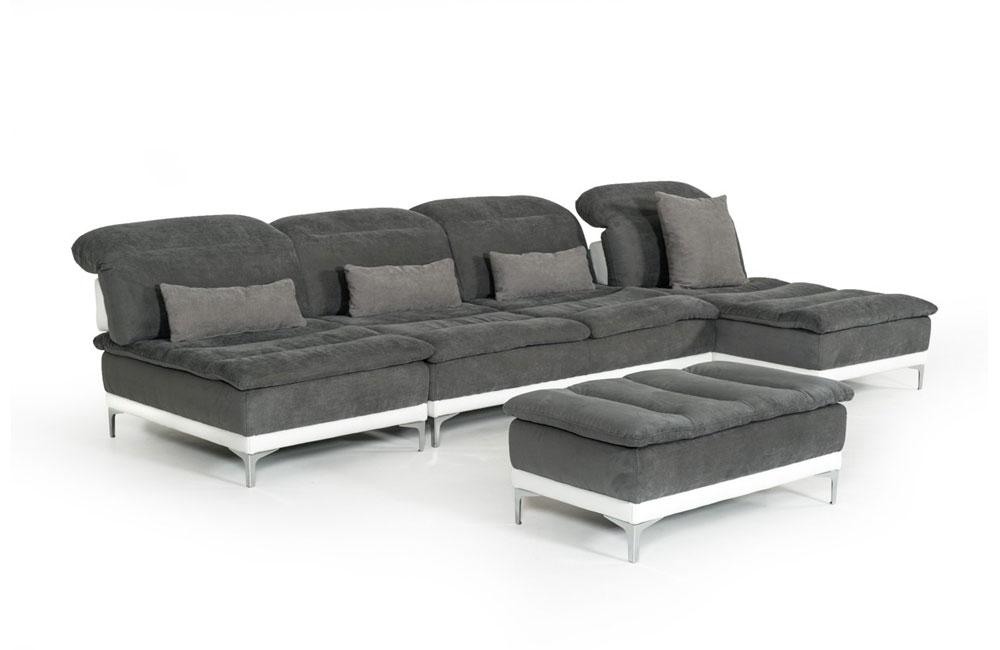 The Horizon Modern Gray Fabric & Leather Sectional Sofa brings in a commodious genteel feel featuring adjustable headrests and cushioned backs in gray fabric and optical white leather upholstery. It features an awesome move back mechanism seatbacks and a fixed back frame on the corner seat. Stainless steel legs provide stable support. It includes 4 lumbar pillows and 3 24x24-inch pillows.