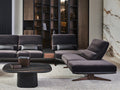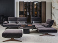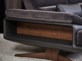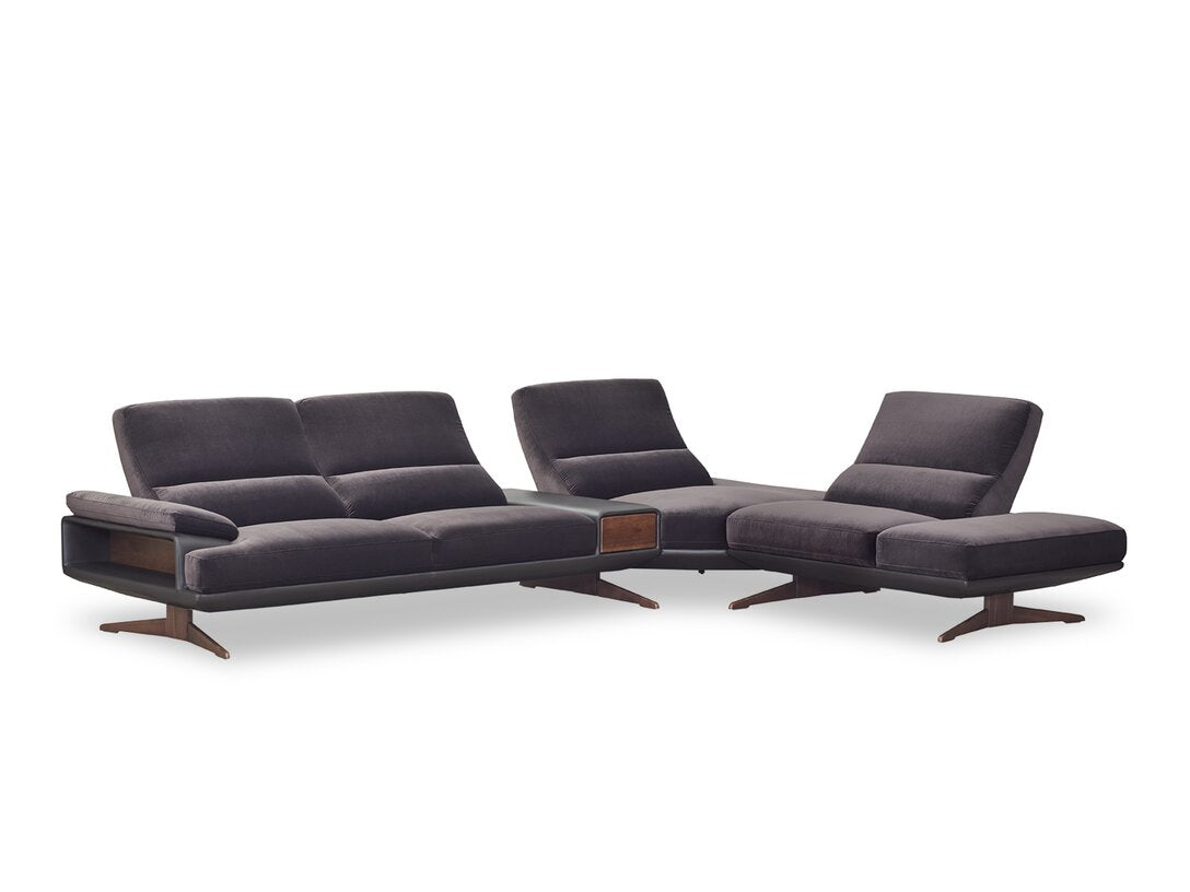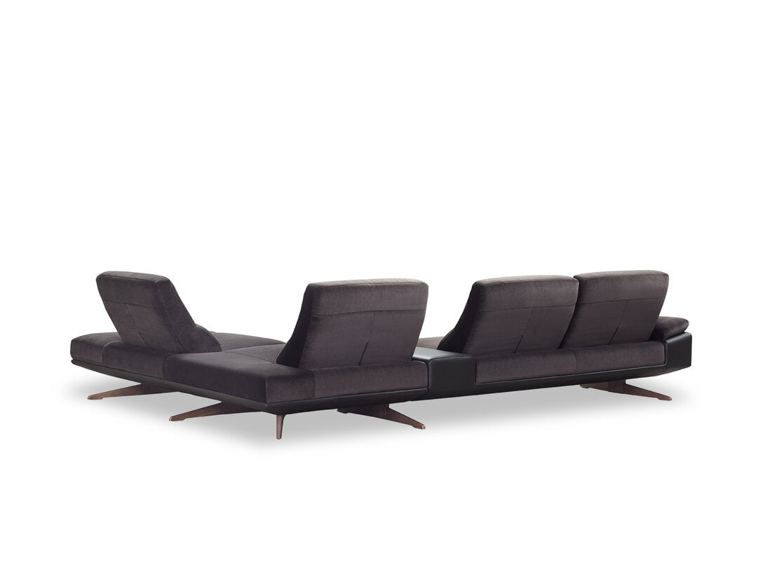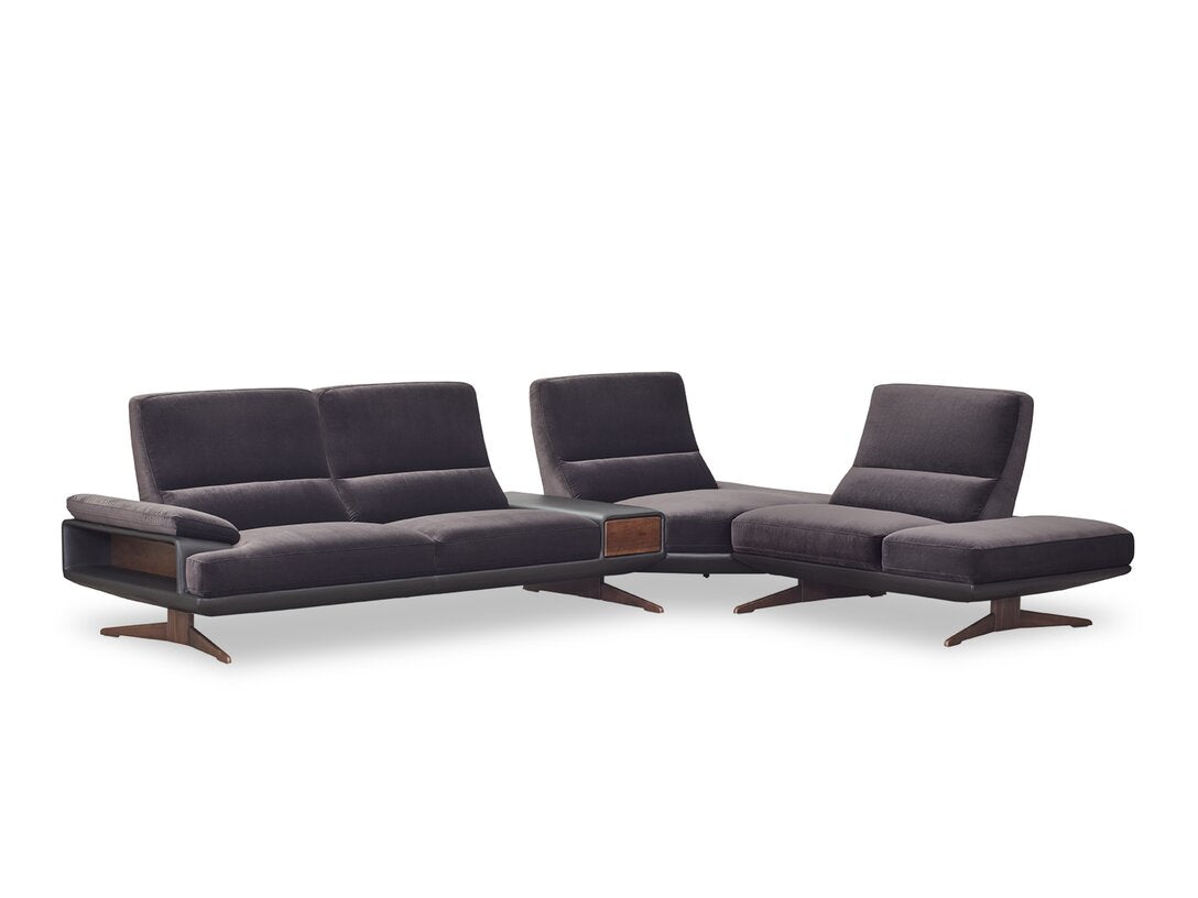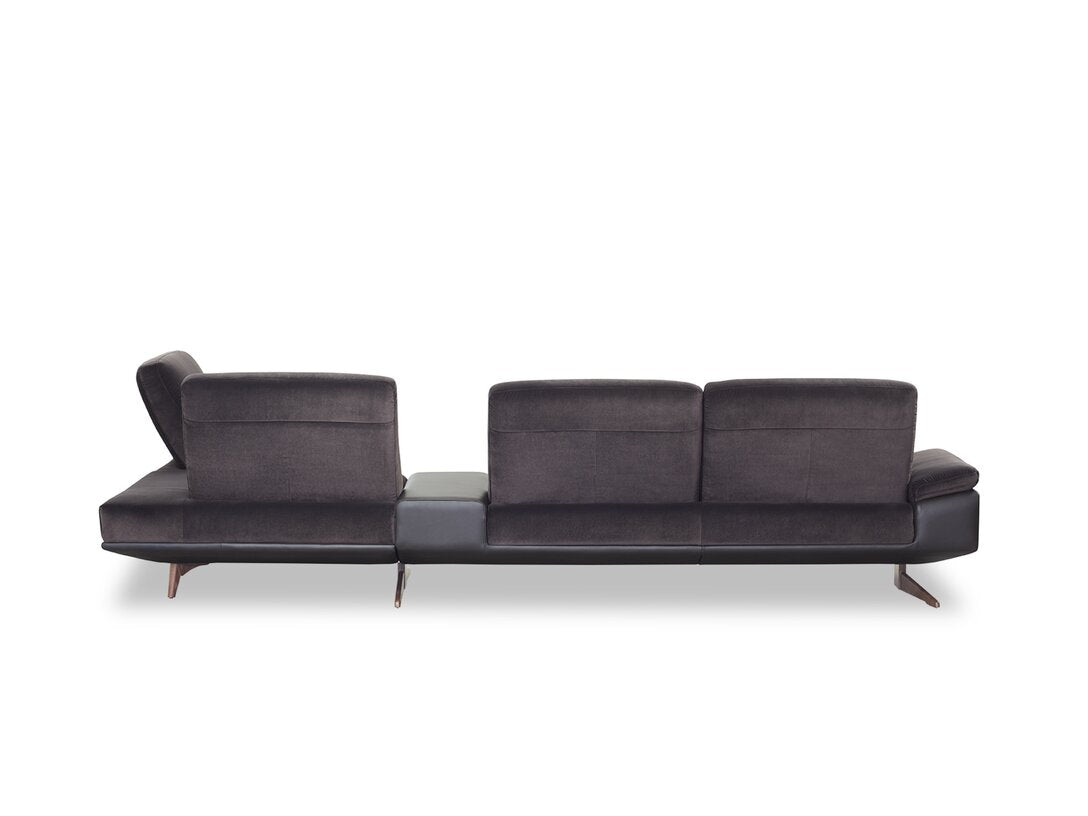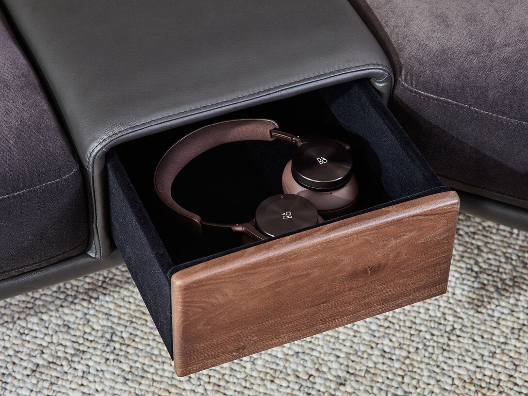 The Nordholtz Hugo sectional sofa is a carefully crafted piece designed to meet the needs of even the most discerning users. Its timeless elegance and superior materials ensure long-lasting durability, making it the perfect addition to any living room. The versatile design features a three-seater sofa with a self-closing drawer, a corner element, and a single element with a terminal instead of a traditional armrest. You have the option to customize your sofa by choosing a configuration with or without a pouffe and the choice of a right- or left-sided arrangement. The sofa is finished with a combination of high-quality fabric and natural leather in a rich brown color, supported by oak skids in mocha. The backrests and headrests can be adjusted to your desired angle, and the drawer is upholstered in sleek black flock. The seats, backrests, and armrests are made with premium foams, fluffy non-woven fabrics, and durable springs.