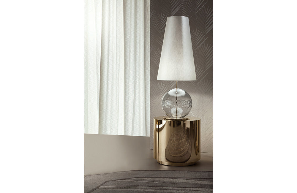 Round end table in light gold chrome stainless steel with Giorgio Collection logo.