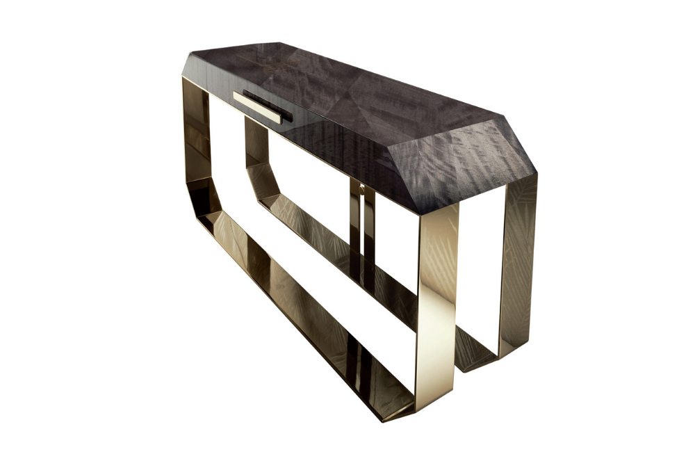 Console in makorè mahogany veneer with high gloss polyester finish.