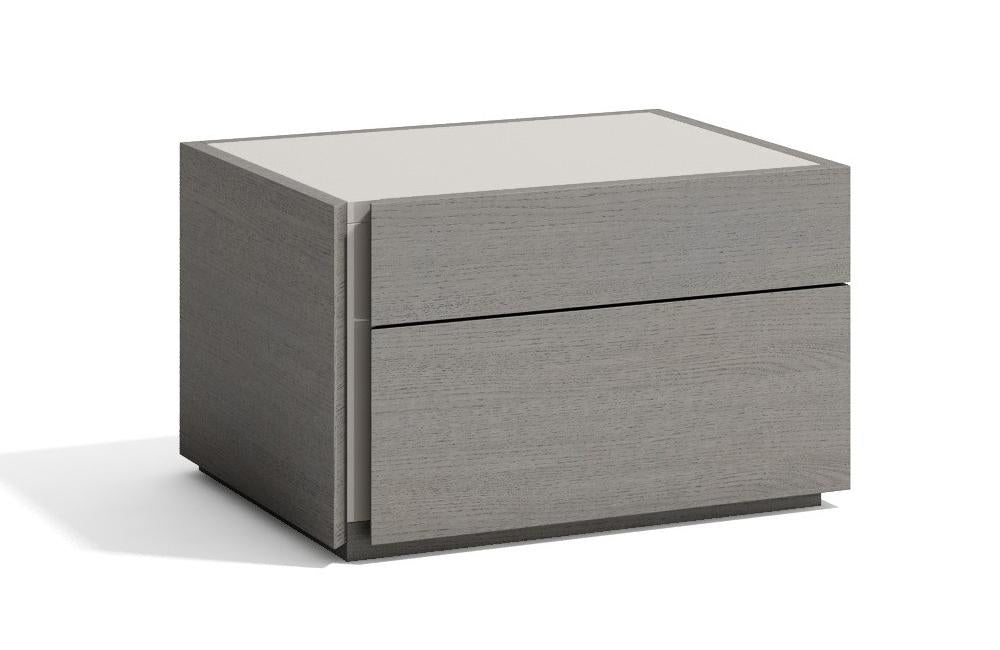 The Ives premium bedroom features a minimalistic, yet classy design which looks striking in any decor. The bed comes in a grey wood veneer, which compliments the low the profile aesthetics. The case goods are also in a grey wood veneer with light grey high gloss accents. These are the same case goods that come with the Porto premium bedroom.