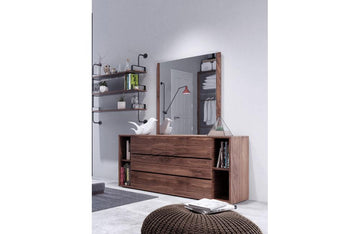 Designed to provide maximum utility and to save space is the Jagger Modern Walnut Dresser and Mirror Set. Featuring a sleek Walnut Veneer finish, this dresser was fitted with 6 spacious built-in drawers. Not only does it give space for your clothes and other stuff, it also has open shelves on both sides, making it a one-stop utility piece. Hang the rectangular mirror over it and you get a quick look of yourself when dressing up. Both the dresser and mirror sport a Walnut Veneer finish made even posh with the wood markings.
