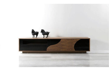 A beautiful play of Walnut veneer & black high gloss that coalesces for an contemporary eye-catching design. Modern TV Base Jaliyah features quality soft closing tracks, and precut holes for easily connecting your choice of equipment.