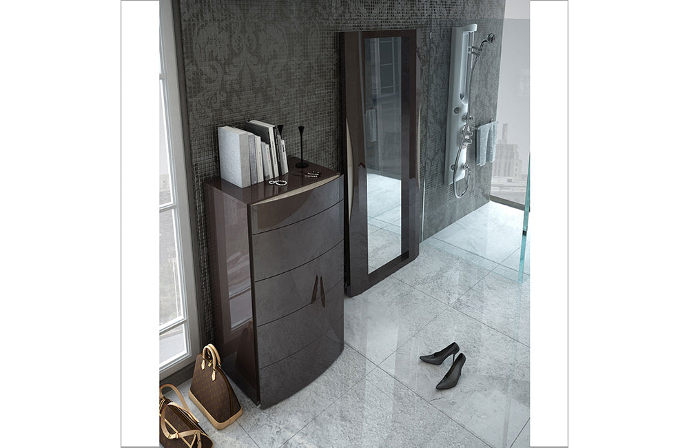 European exclusive design and construction. Brown lacquer finish wood with easy to use large drawers equipped with smooth railing mechanism. It stands on round steel silver finished legs and offers platform bed with the beige and brown combination headboard. All drawers are equipped with self closing mechanisms.