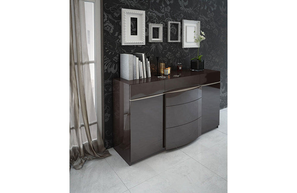 European exclusive design and construction. Brown lacquer finish wood with easy to use large drawers equipped with smooth railing mechanism. It stands on round steel silver finished legs and offers platform bed with the beige and brown combination headboard. All drawers are equipped with self closing mechanisms.