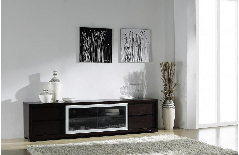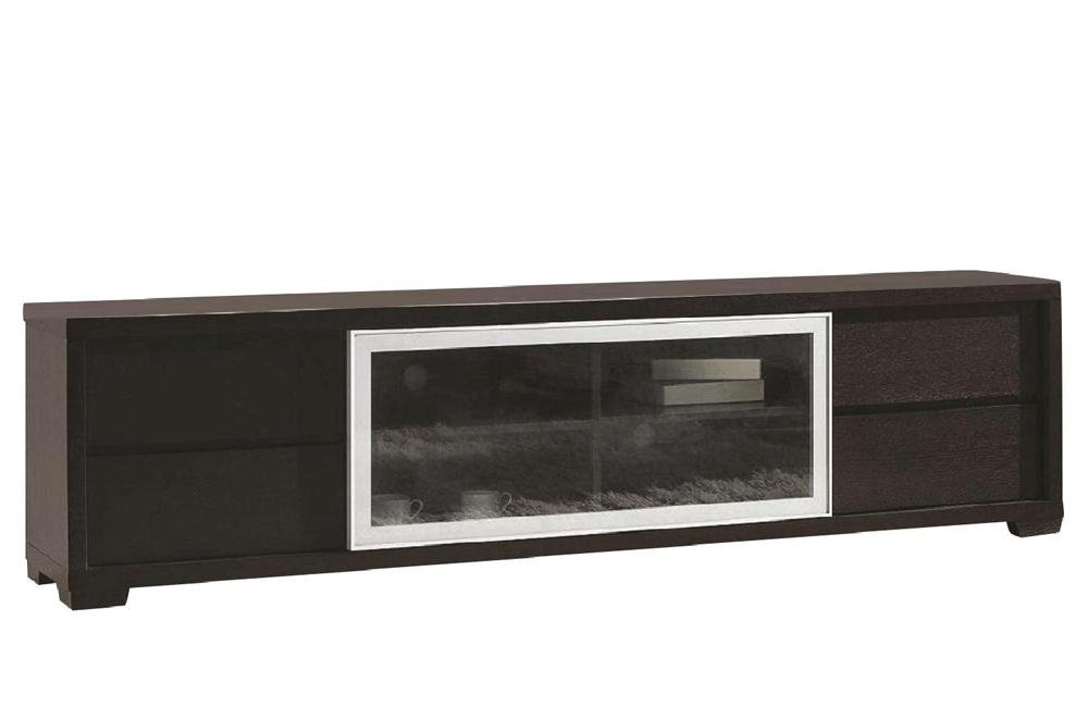 Preassembled TV Stand with 4 drawers and sliding glass door. Wenge Finish.