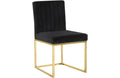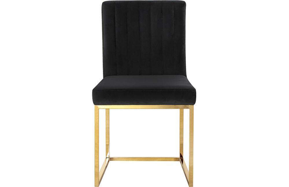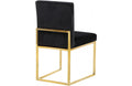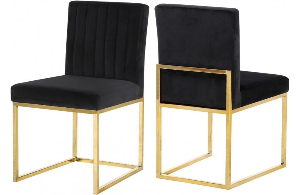 Take dining to a posh new level with this Jorge Black Velvet Dining Chair. A boxy design makes it a nice addition to contemporary spaces, and it's armless design makes it easy to get into and out of with ease. The seat and back are upholstered in rich black velvet for a lavish vibe and a pop of sumptuous color to liven up your room, and both are padded well to make sure diners stay comfy while they enjoy their meal. The metal frame is finished in gold for added beauty and aesthetic appeal.