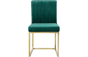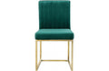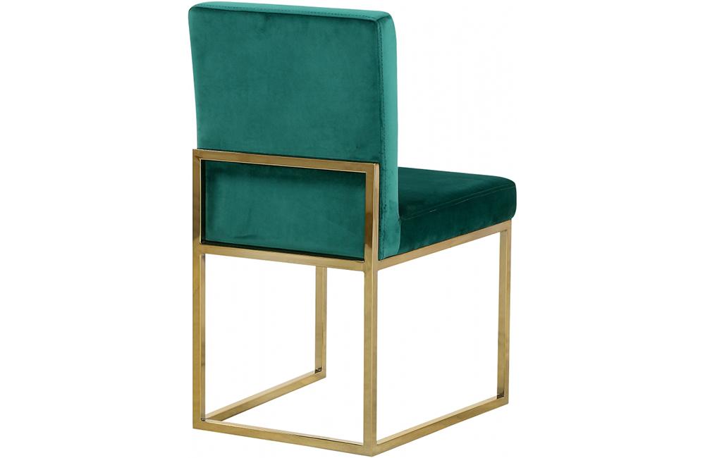 Take dining to a posh new level with this Jorge Green Velvet Dining Chair. A boxy design makes it a nice addition to contemporary spaces, and it's armless design makes it easy to get into and out of with ease. The seat and back are upholstered in rich black velvet for a lavish vibe and a pop of sumptuous color to liven up your room, and both are padded well to make sure diners stay comfy while they enjoy their meal. The metal frame is finished in gold for added beauty and aesthetic appeal.