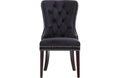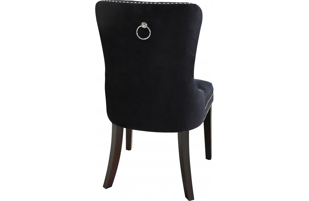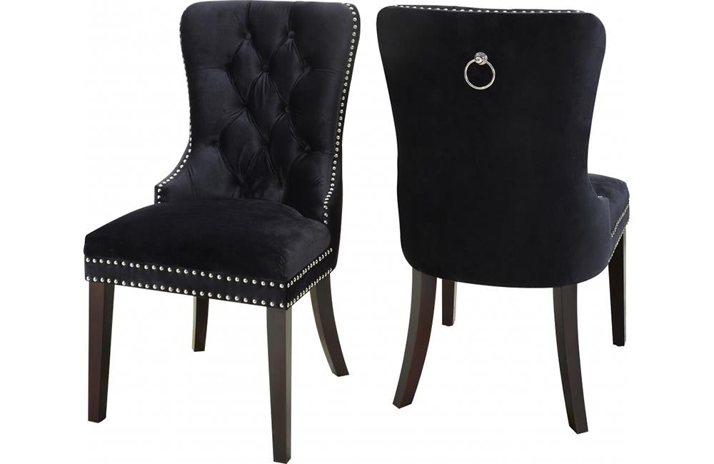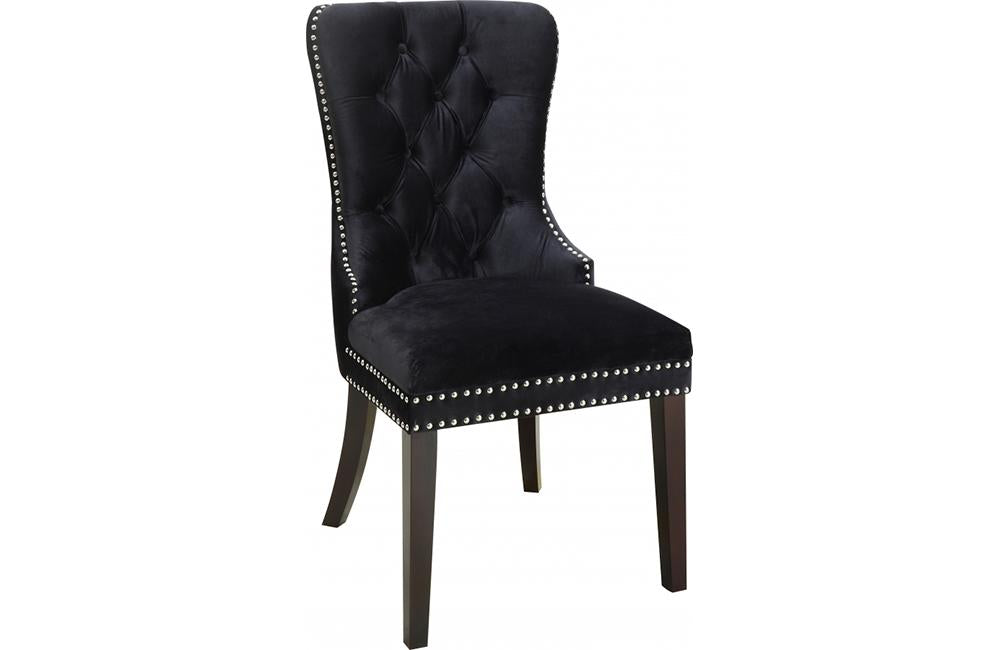 Dine in luxurious style with the Jose black velvet dining chair. Featuring a curved high back, plush cushioned seat and deep tufted black velvet upholstery studded with chrome nailheads, this dining chair is sure to take your dining experience to a whole new level. Espresso wood legs provide sturdy support and complement the stunning black upholstery for a sleek, contemporary design.