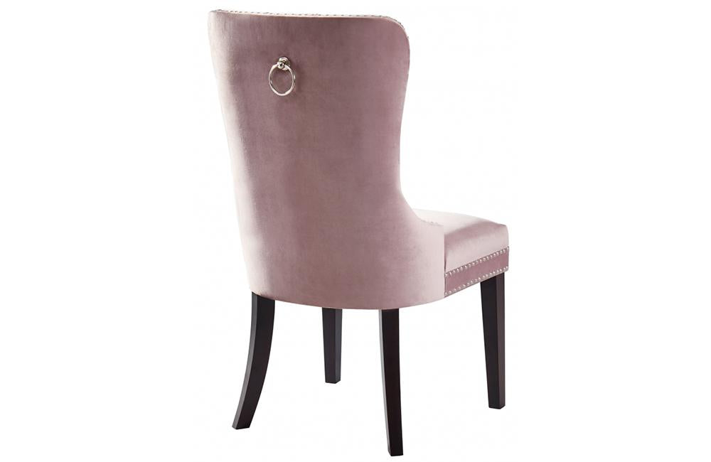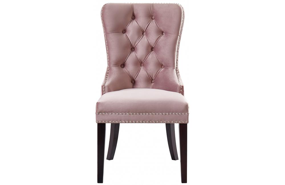 Dine in luxurious style with the Jose Pink velvet dining chair. Featuring a curved high back, plush cushioned seat and deep tufted black velvet upholstery studded with chrome nailheads, this dining chair is sure to take your dining experience to a whole new level. Espresso wood legs provide sturdy support and complement the stunning black upholstery for a sleek, contemporary design.