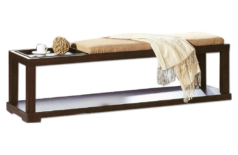 Kalyca Bedstool- Wood solids and veneer on medium density fiberboard. Padded polyester fiber basket weave seating. Removable serving tray.