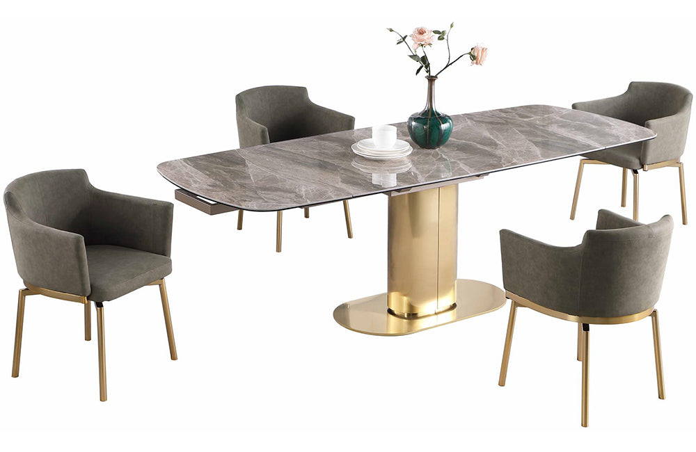 - Detail Description: Dining Set w/ Extendable Marbleized Sintered Stone Table & Memory Swivel Arm Chairs w/ Golden Legs