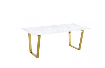 Attract attention to the center of your dining room with Kelby gold stainless steel dining table by Meridian Furniture. Featuring a genuine marble top and a stunning rich gold finish stainless steel base, this dining table is durable and stylish, complementing your contemporary home decor theme while guaranteeing to withstand the wear and tear of daily use for years to come.