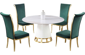 - Detail Description: Dining Set w/ Sintered Stone, Wooden, and Golden Table w/ High Back Golden Frame Side Chairs