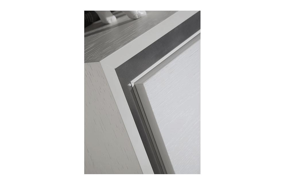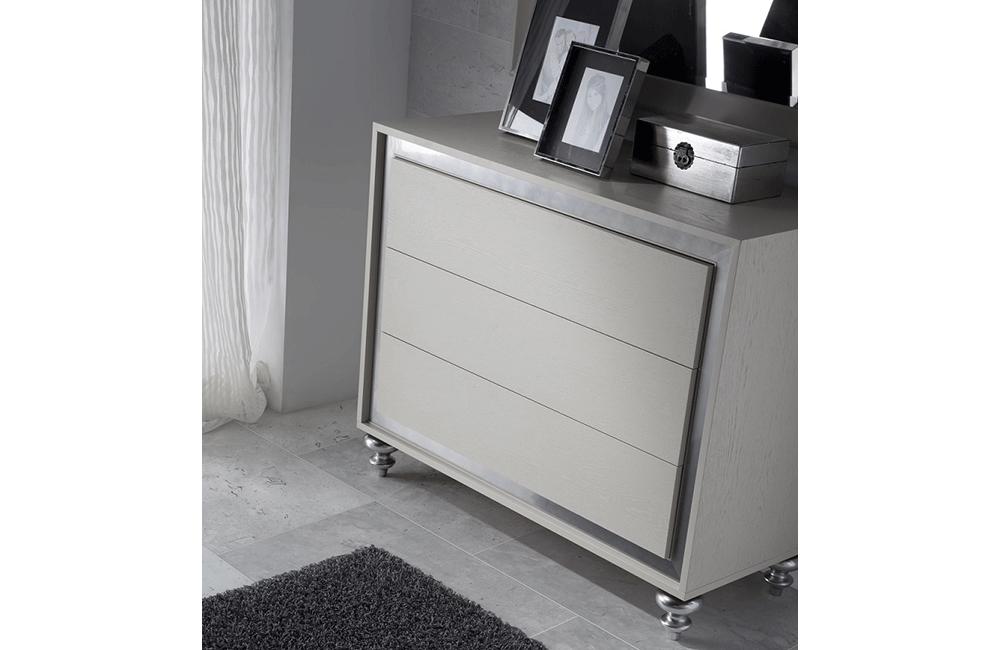 fuse old world craftsmanship with contemporary design to produce quality furniture with sophisticated appeal. The Kiley Premium Bedroom Set features solid wood construction, with silver accented oak veneer. The headboard is skillfully hand carved for a distinguished look which is nothing less of astonishing. The case goods are crafted from solid wood and features matching silver accents with soft closing drawers using premium hardware by Blum, a world-renowned German manufacturer that sets the standards for the finest quality furniture hardware.