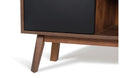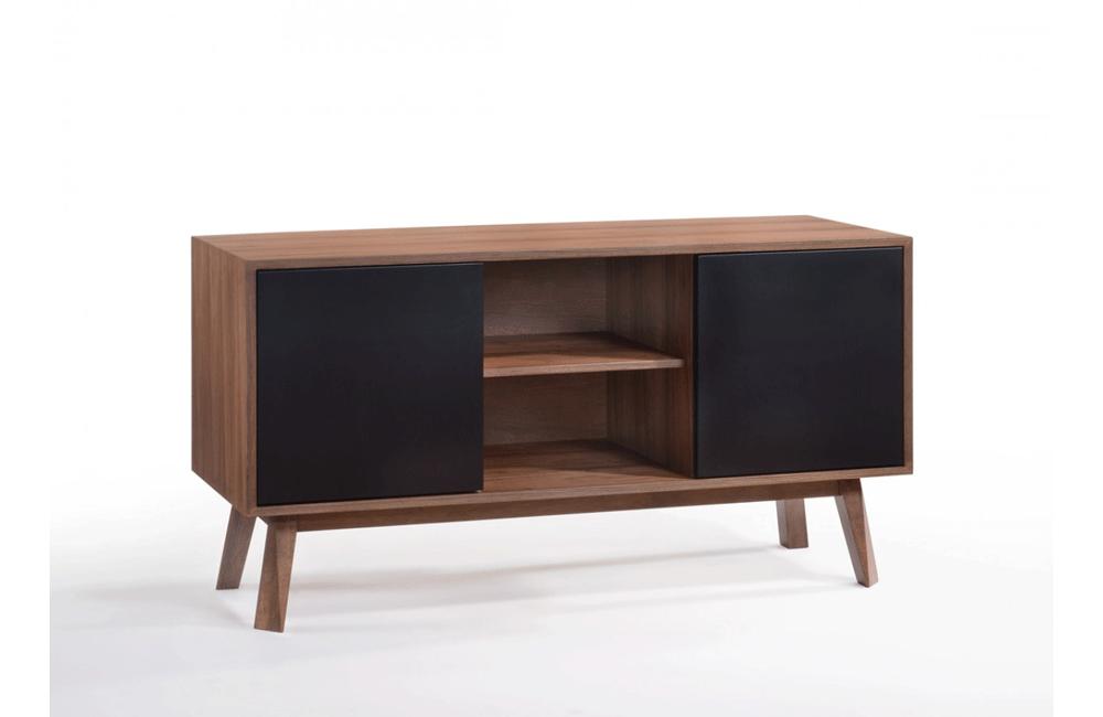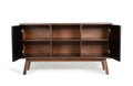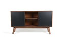 The Laken Modern Walnut & Black Buffet features a genteel style featuring a polished Walnut veneer body. It offers ample storage featuring 2 cabinets with plane black doors with 2 inside shelves and a 2-level open shelf in the center.