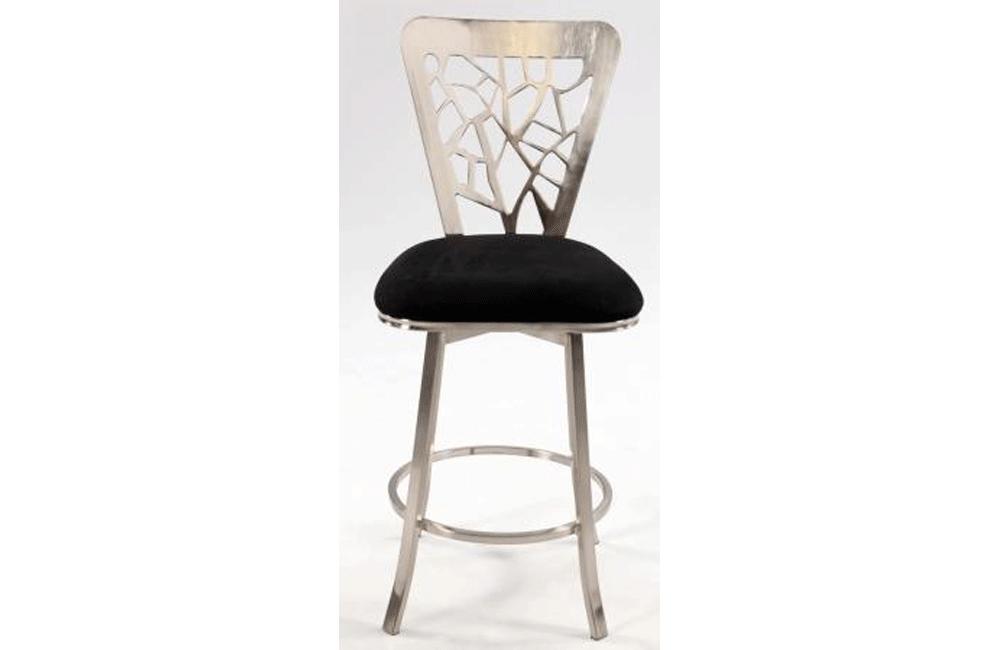 Beautiful laser cut back in brushed nickel with Black microfiber cushioned seat. This stool is available in bar or counter height.