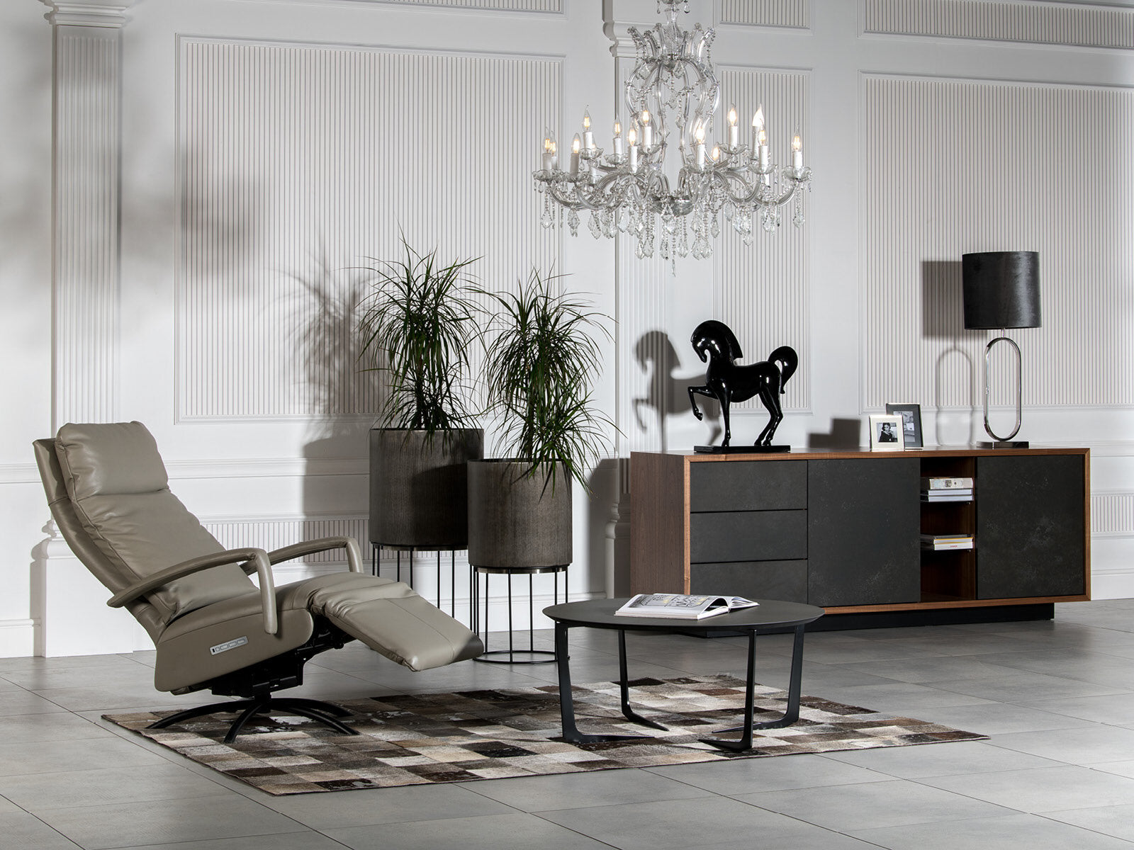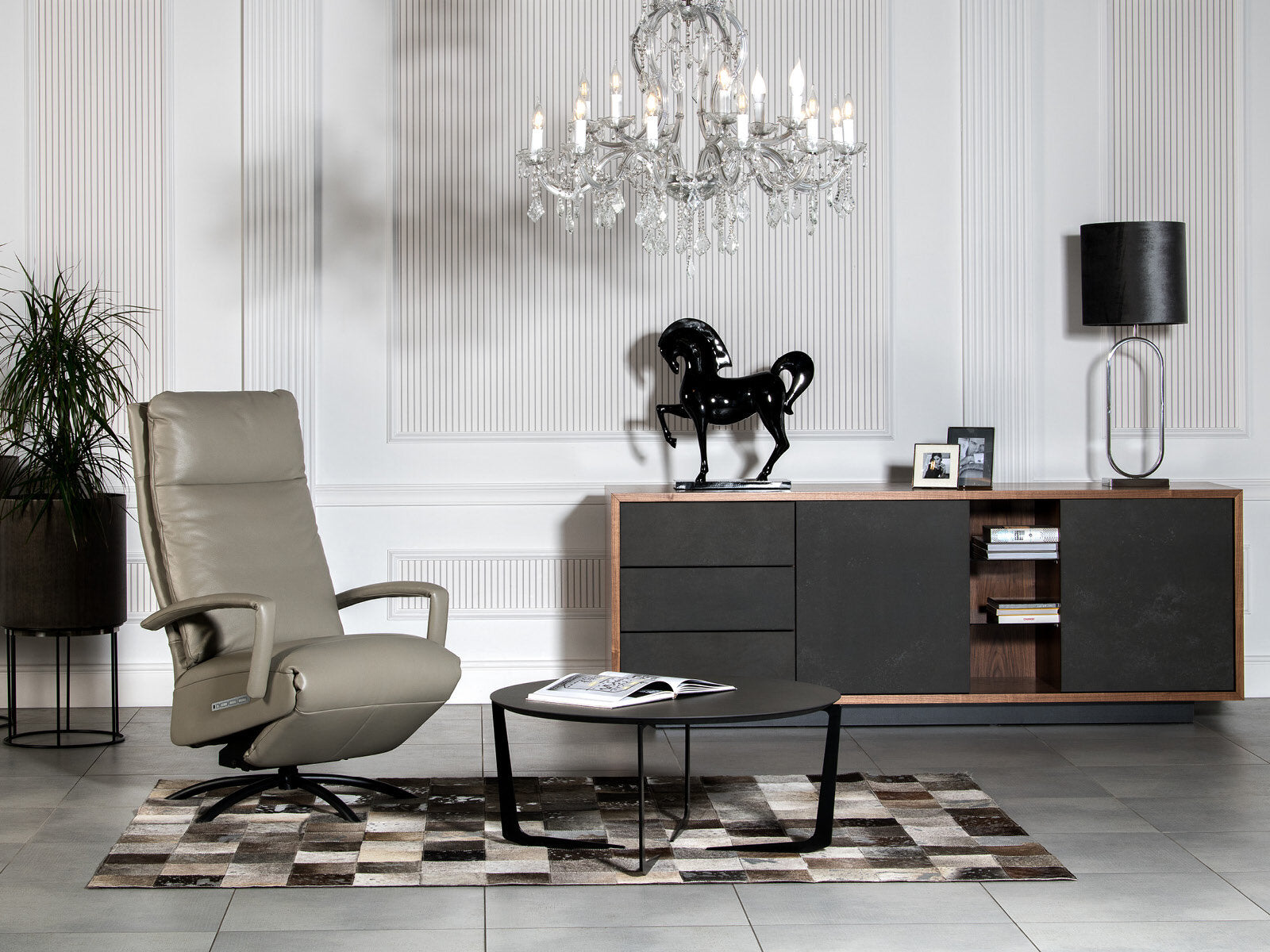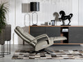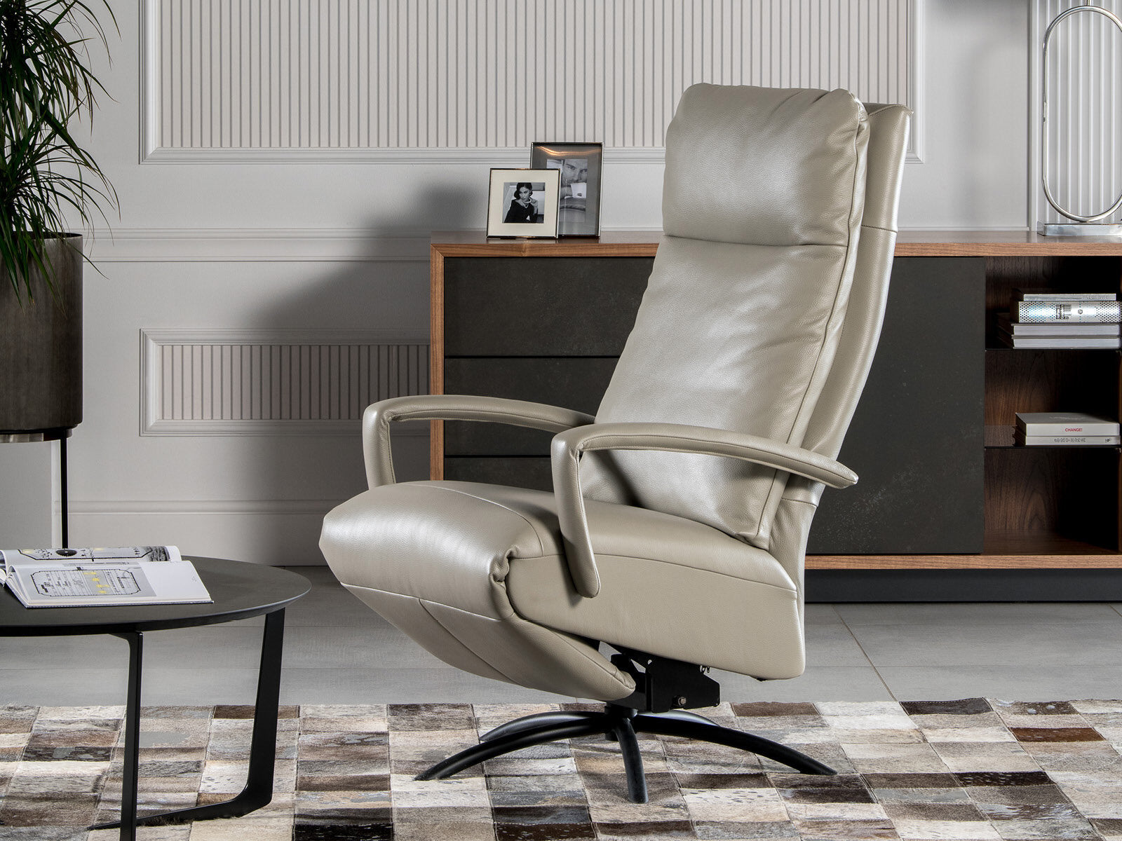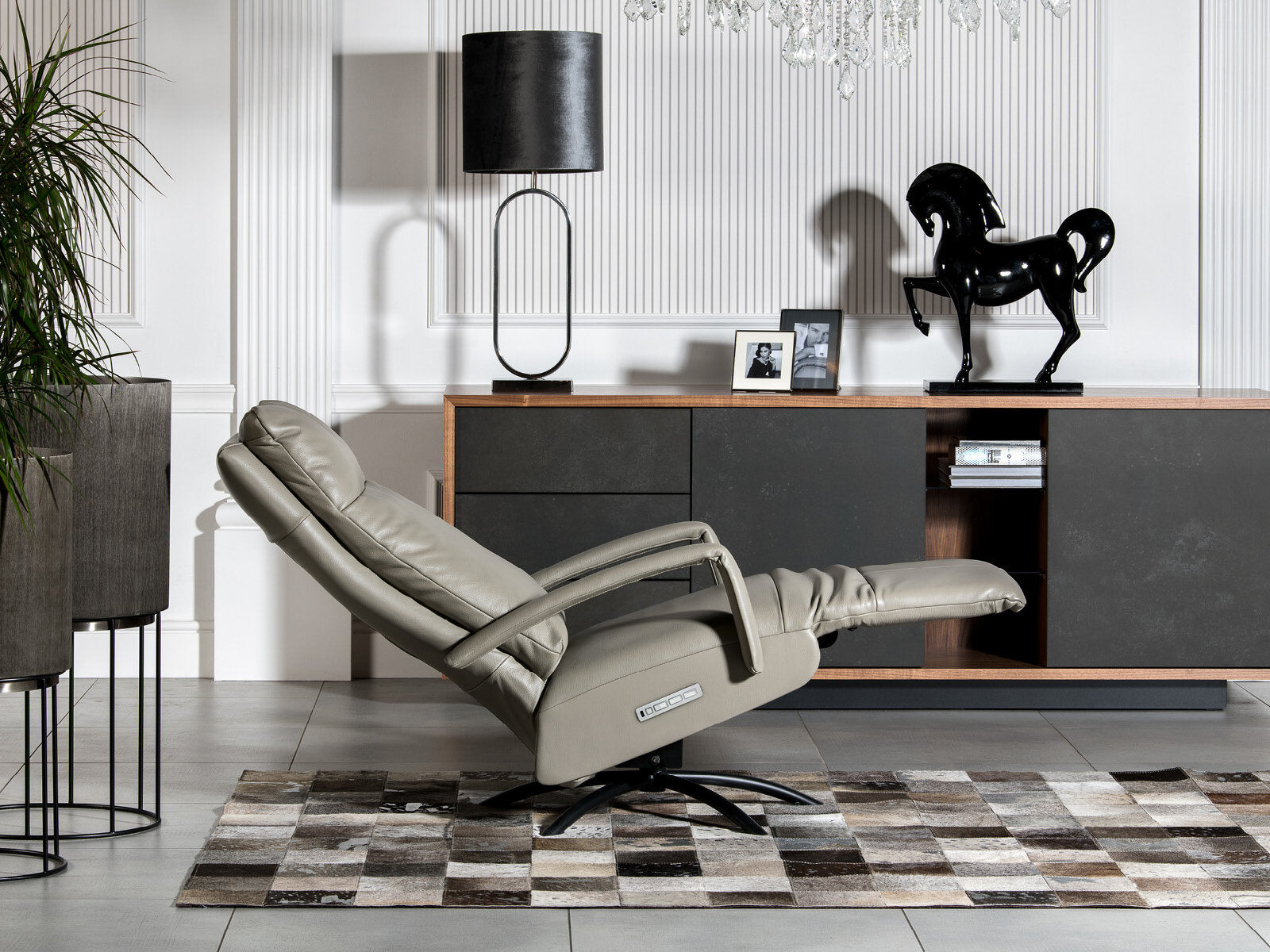 The slim design of Nordholtz Leni armchair is a notable feature that draws attention. Through the use of high-quality materials, this furniture offers undeniable comfort and functionality, making it a versatile addition to any home, office, or study. The chair is crafted from natural gray leather and features a rotating metal leg in a black "spider" design. It boasts two separate mechanisms for extending the footrest and adjusting the backrest, both powered by electric motors and batteries. Additionally, the innovative ZERO GRAVITY system allows for a deeper recline and elevation of the feet, providing relief to the lower back, hips, and heart while reducing stress and regulating blood pressure. The headrest can also be delicately adjusted for maximum comfort. The LIFT UP system, which elevates the chair for ease of standing, is particularly useful for those with mobility issues. To further personalize the chair, the upholstery material and color can be changed upon request.