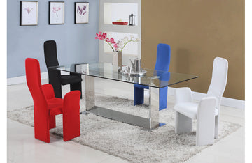 This dining room set is a modern tour de force, featuring a splendid table topped by clear tempered glass and microfiber chairs which are truly works of contemporary art. A great choice for any consumer seeking to give their dining room a new and improved look. This set is available with Letizia armchairs in black,white, red and blue colors