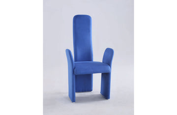 This stylishly ostentatious armchair is fully upholstered in soft blue fabric. Its ultra modern profile makes it an ideal addition to your contemporary styled dining room.