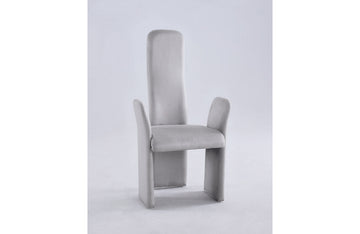 This stylishly ostentatious armchair is fully upholstered in soft gray fabric. Its ultra modern profile makes it an ideal addition to your contemporary styled dining room.