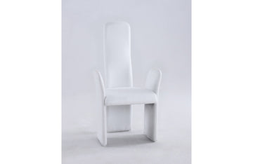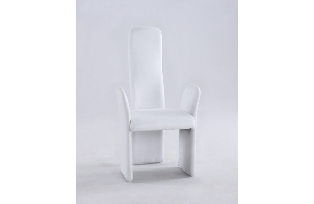 This stylishly ostentatious armchair is fully upholstered in soft white fabric. Its ultra modern profile makes it an ideal addition to your contemporary styled dining room.