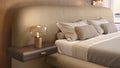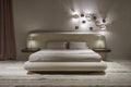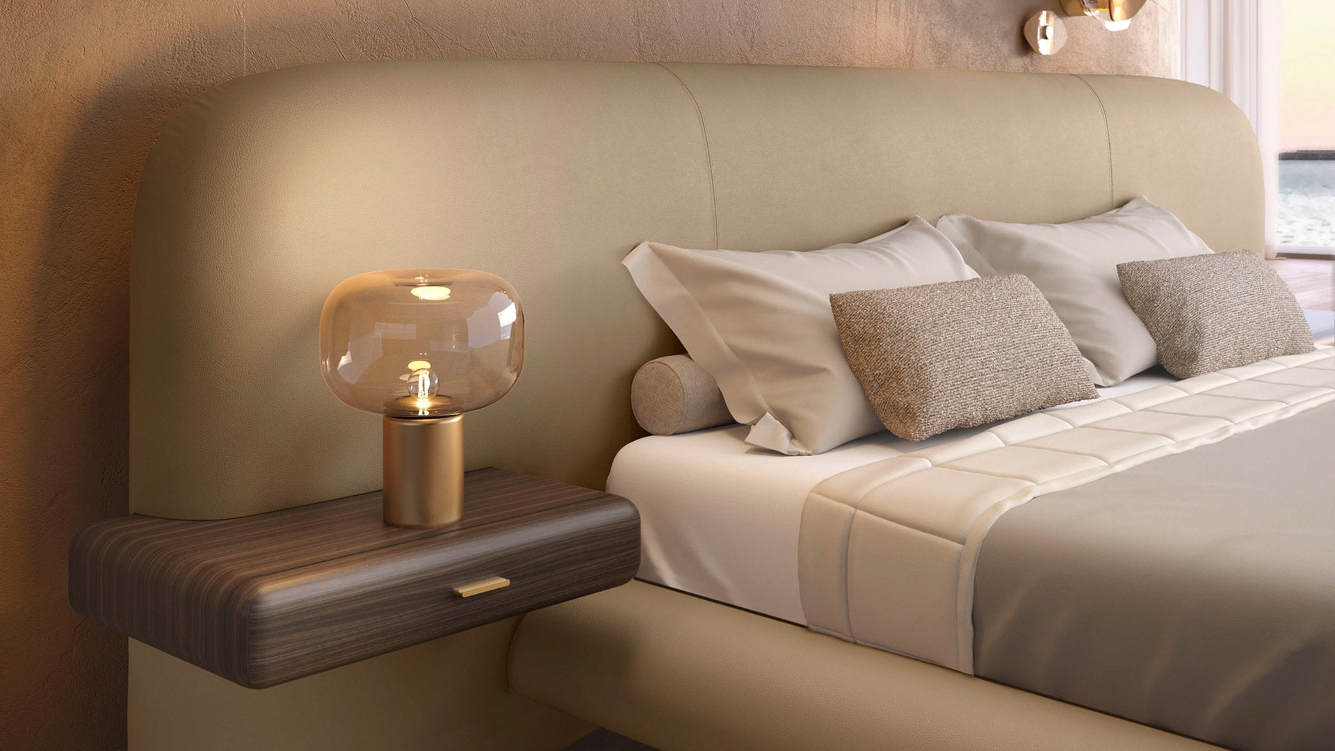 Dune features a Canaletto walnut headboard with built-in drawers. The design combines