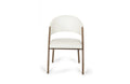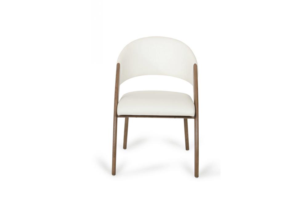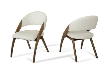 The Lucas Modern Cream & Walnut Dining Chair offers a new-fangled design featuring cream leatherette upholstery and Walnut finished solid wood frame. It features a full seat design with a crescent-shaped back seat. The cream leatherette upholstered back attached to the front legs with a sloping design. Ventilation is offered with the space between the seat and the back.