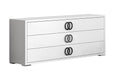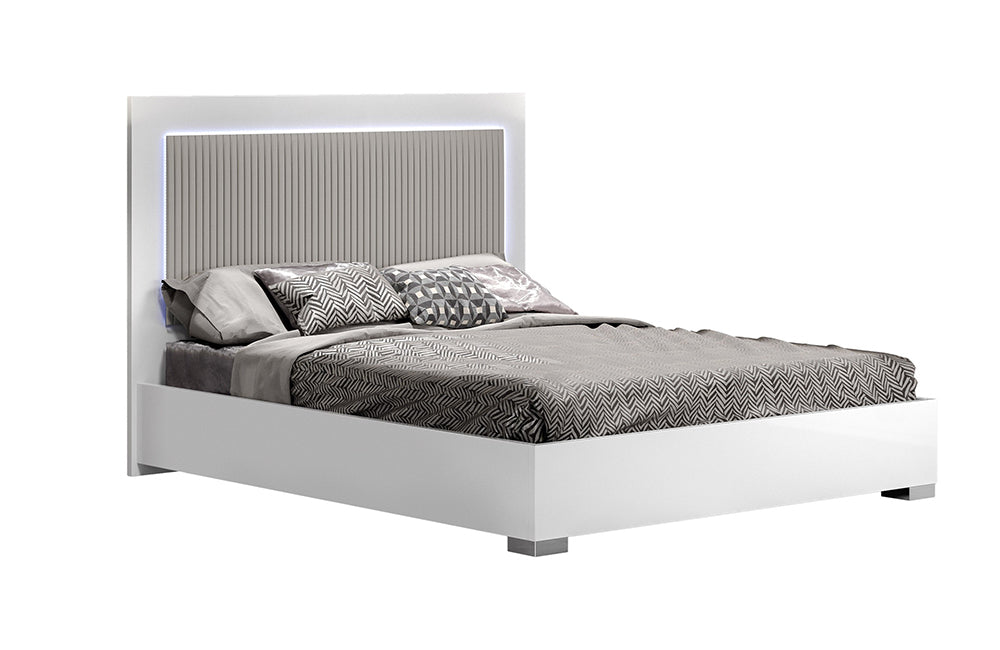The Luxuria Bedroom collection by Paramus Furniture is the new standard for posh modern. This bedroom, masterfully crafted in Italy, blends touches of modern and flashy aesthetic to create a timeless look perfect for any home. The white high gloss lacquer finish throughout the bed and case goods are complimented by the vertically tufted grey microfiber headboard. The additional LED light feature further highlights this centerpiece of a headboard. You will also find the Luxuria collection adorned with black gloss handles encompassed in chrome, and chrome feet throughout.