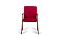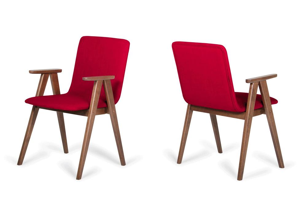 The Maddox Modern Red & Walnut Dining Chair features a well turned out design featuring red linen fabric upholstery. Featuring a high cut upturned V-shape Walnut finished rubber wood frame and stadium-shaped arms that are inches away from the back. The seamed edges and round corners of the continuous seat and back design added to its charm. Available also in Gray.