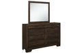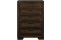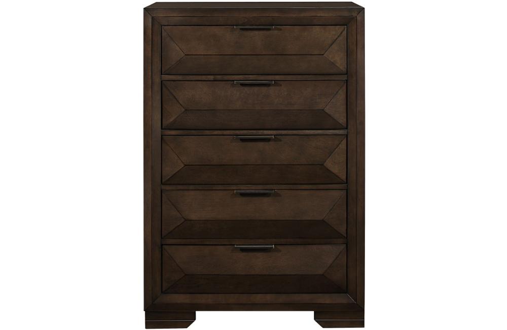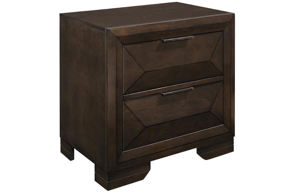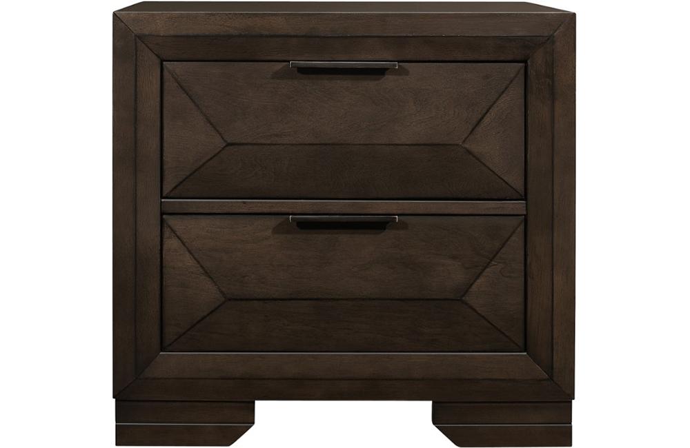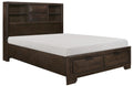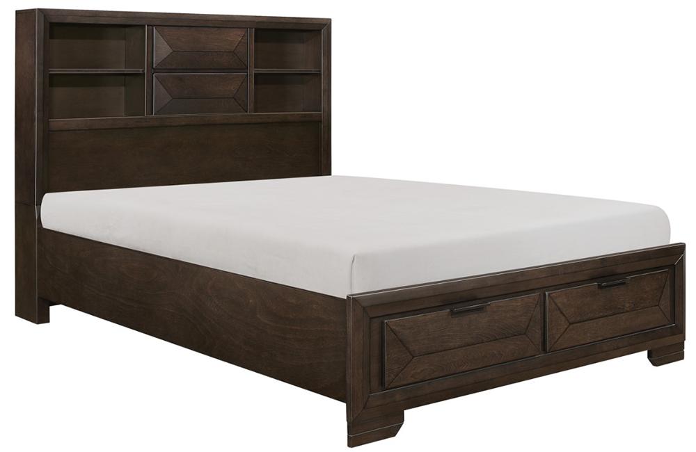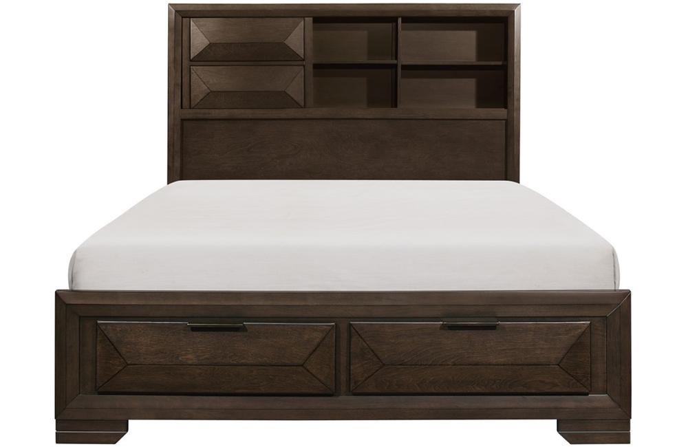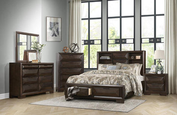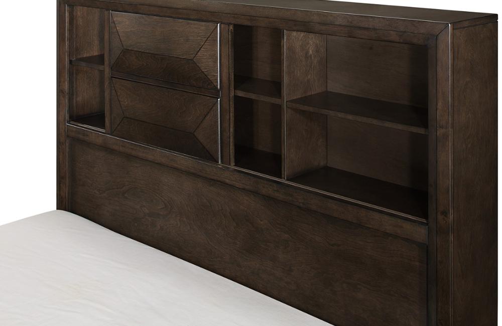 Contemporary design and convenient functionality intersect in the design of the Magna Collection. Birch veneer is finished in a warm espresso in this unique bedroom offering. Raised panels provide visual interest to the drawer fronts, headboard and footboard. The bookcase headboard provides ample storage and display space as does the storage drawer footboard. Complementing horizontal metal hardware lend additional accent to the case pieces.