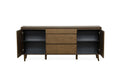 The Marcia Modern Tobacco Buffet is a snazzy piece of creation featuring a lustrous Tobacco veneer finish. It features 2 cabinets with doors and 3 equal-sized drawers for that much needed storage space. It stands on sturdy tapered and bar-shaped wood legs that require assembly.
