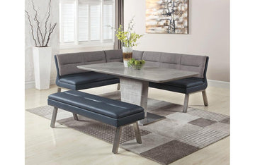 This comfortable nook comes replete with not only great looks, but plenty of function! It features a 2 inch deep underseat storage area and is fully reversible so it can fit in at any part of the dining room table. Alongside its lovely 2 tone blue leatherette and gray fabric upholstery, this is truly what you need to bring a contemporary styled room together. A modern extendable table from 55.12" to 70.87", easy storing butterfly leaf (15.75''), simulated concrete pedestal with metal accents and a metal floor plate. This beautiful bench comes replete with not only great looks, but plenty of function! It features a 2 inch deep underseat storage area and boasts plush blue leatherette upholstery, making it a great choice for any modern styled living or dining room. Set includes Dining Table,Dining Nook, Dining Bench