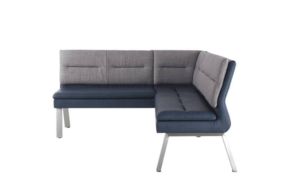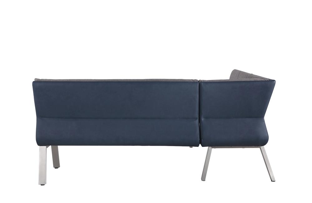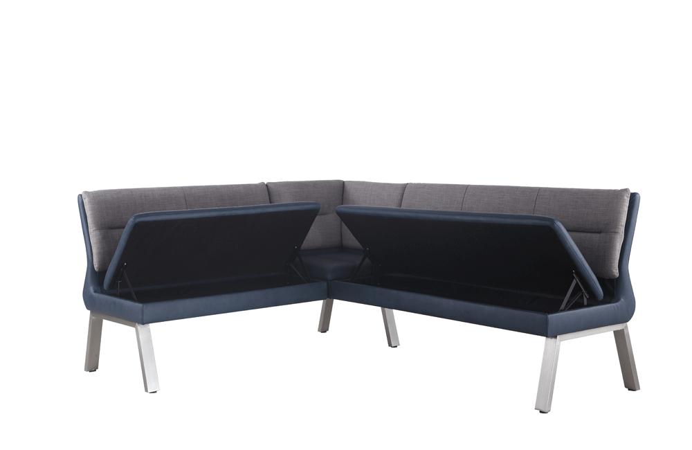 This Nook features a two-tone contrast for your kitchen or dining room with textured stone gray cotton fabric cushions and soft leatherette upholstery in a light blueberry blue for a soothing finish. The contemporary style is found with the brushed stainless steel legs and tufted accents. For your convenience, there is hidden storage when the seat is lifted