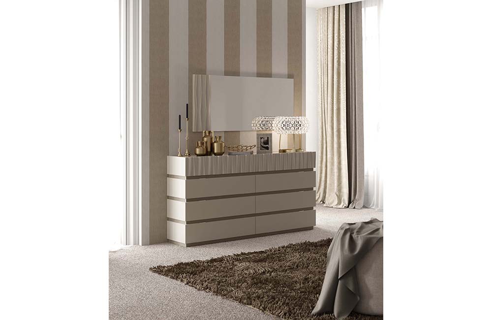 Eco-Leather headboard with matt finish together make the bedroom set adorable with quiet look. Set available as King or Queen Size Bed with Nightstand , Dresser and Mirror. Also you can add Chest or 2 Door Wardrobe. All drawers are equipped with self closing mechanisms.