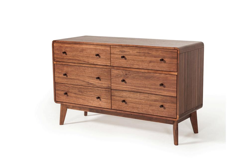 Storage space will no longer be a problem with the Marshall Mid-Century Modern Walnut Dresser. Fitted with 6 commodious drawers with tubular dark Walnut pulls, the equal sized drawers will make your bedroom spic and span. Accentuated with wood markings on the surface, this mid-century modern dresser rise above the floor with sturdy Walnut finished solid Rubber wood legs that taper at the ends.