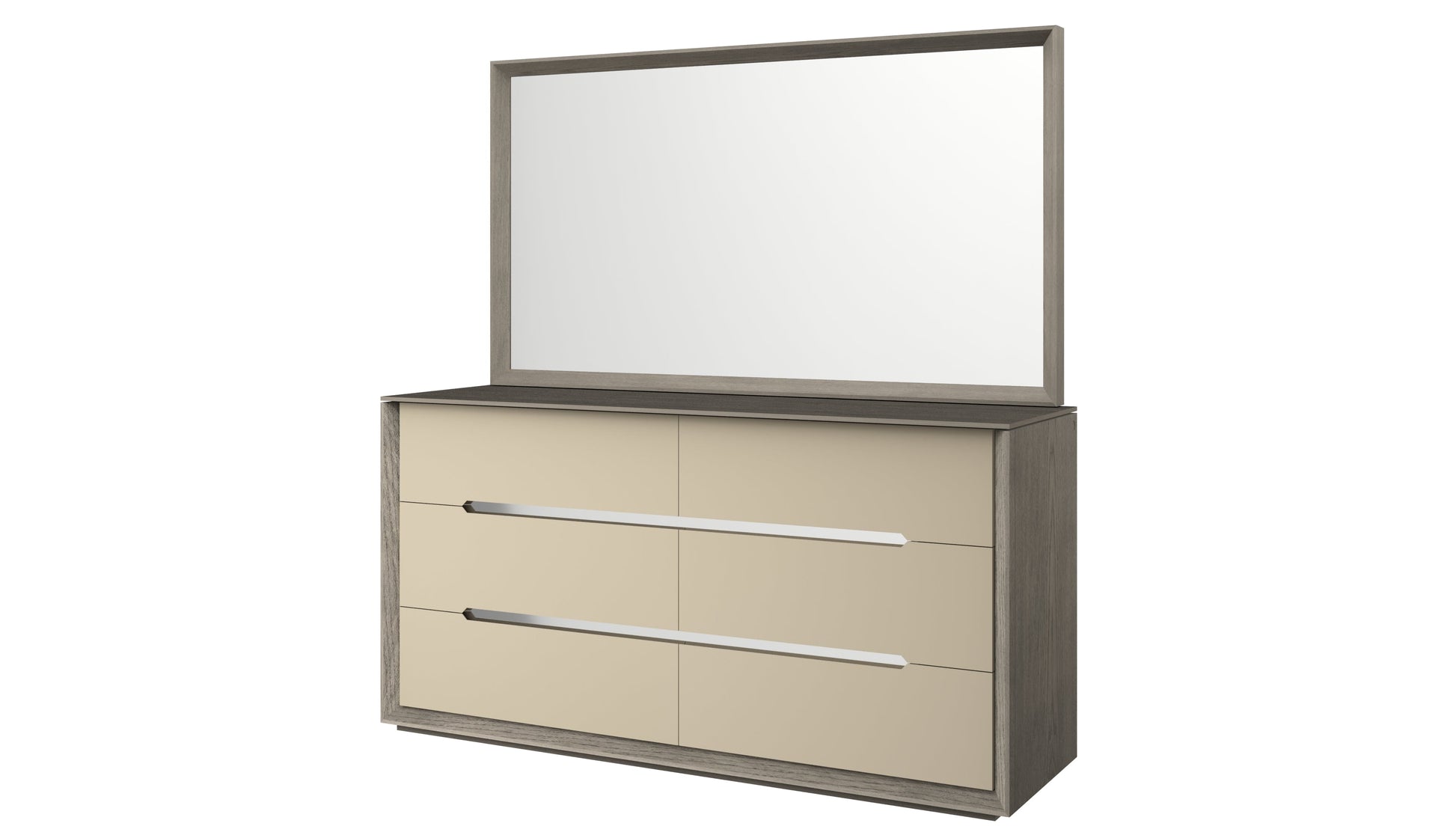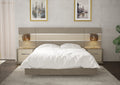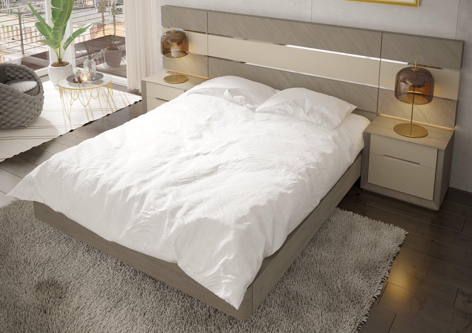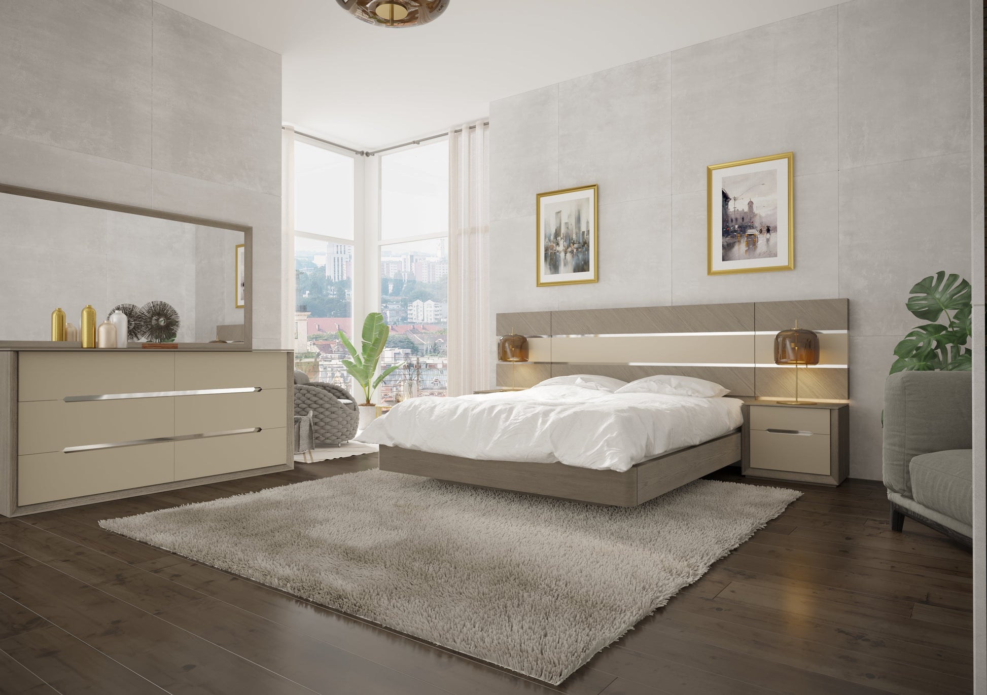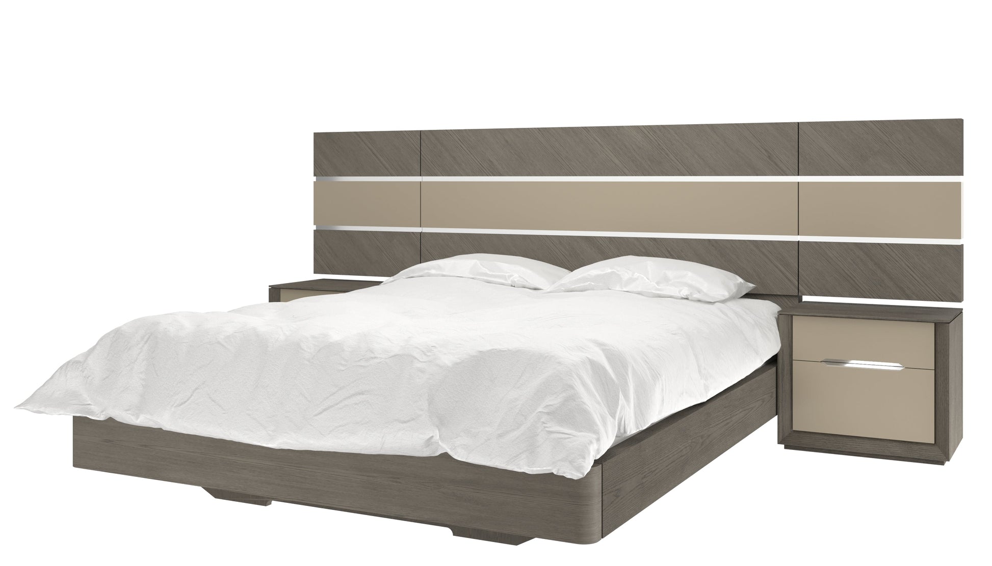 The Martina premium bedroom features an elegant design with a natural ash grey finish combined with beige inserts. The long headboard stretches and covers both nightstands, also there is an LED light which add extra touch and ambience atmosphere. This is a platform bed, so no box spring is required The case goods come equipped with soft closing tracks by Blum, a world-renowned German manufacturer that sets the standards for the finest quality furniture hardware.