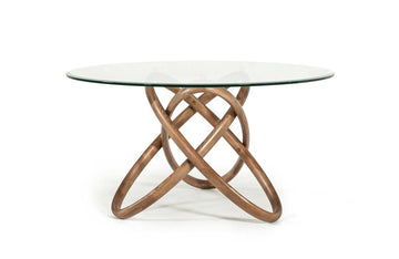 A stunning display of imagination is the Mason Modern Round Glass and Walnut Dining Table. It rests atop a solid Ash base in Walnut color. The circular base is composed of various circular solid Ashes that were twined together in a pirouette fashion. Seating 4 comfortably, this modern dining table gives your dining room a class of its own.