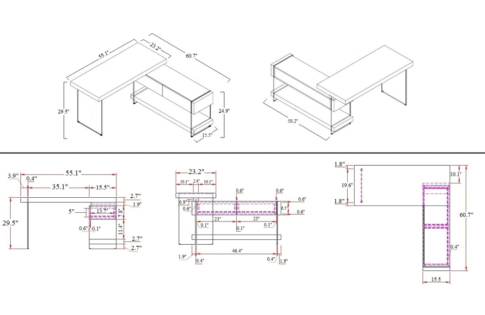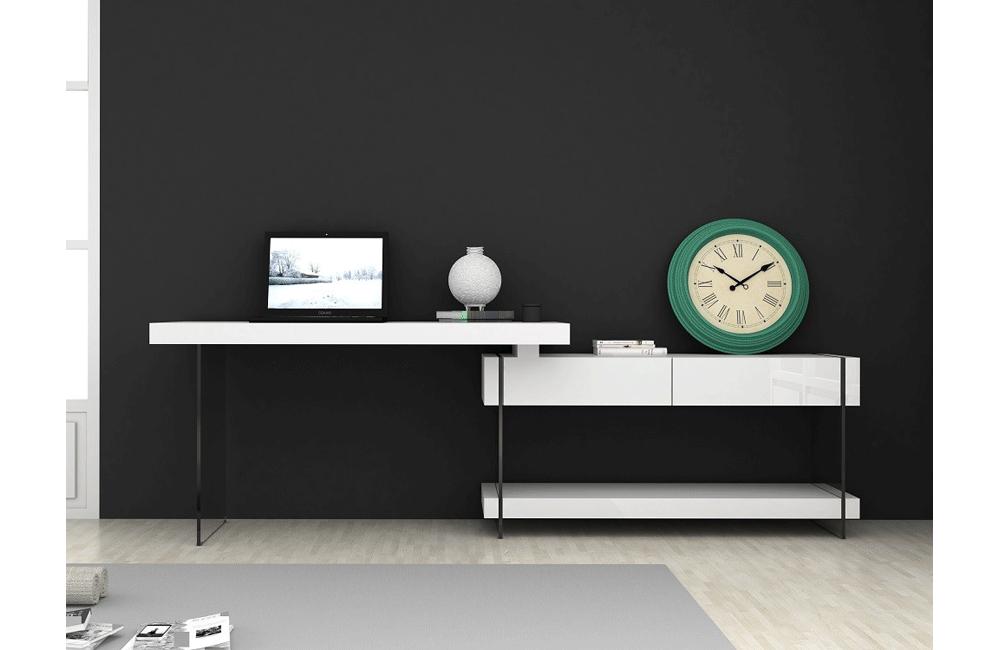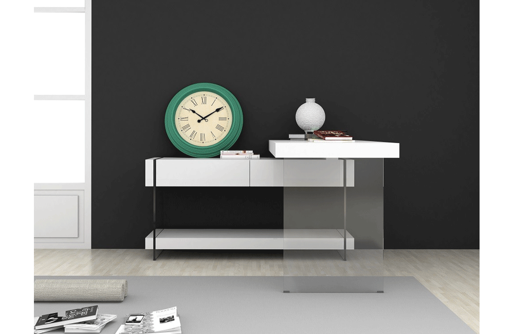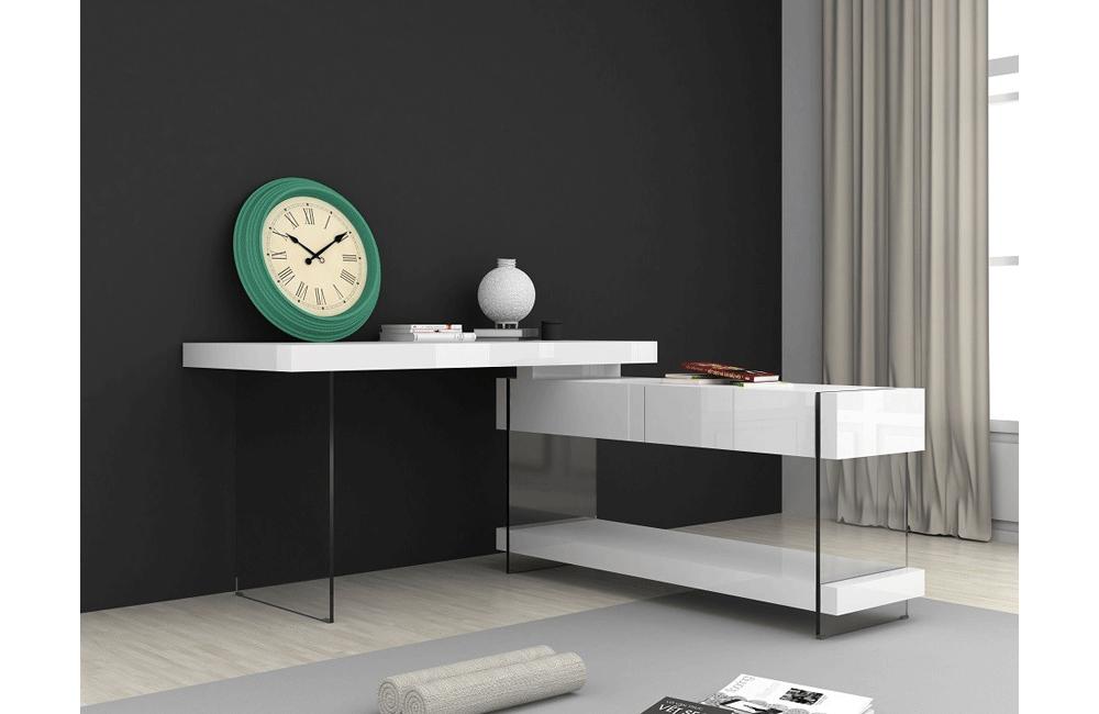 desk collection. The Maurice desk is finished in a sophisticated white gloss, with thick resilient tempered glass for a sleek, chic finish. The design permits for one to swivel the desk top 360 degrees for convenience. The unique pedestal features two soft close drawers for storage & plenty of space for a printer, or other uses. Great for a home office, dorm, or bedroom.