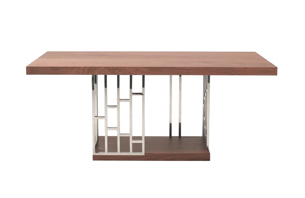 Crafted from a beautiful walnut veneer, the Maverick Dining Table is an eye-full. The walnut table top is supported by stainless steel legs with an alluring design that contrast the top perfectly.