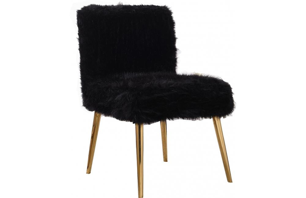 Turn your room into a posh space with the modern Meg black fur accent chair by Meridian Furniture. Featuring plush black fur that is heaven to relax on and shiny stainless steel gold legs, the contemporary Tiffany accent chair is perfect for any room in your home.