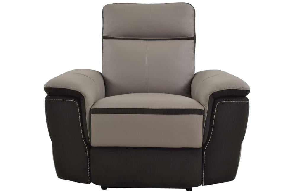 Providing ample seating for your friends and family is the Messa Collection. The classic sectional shape is book-ended by stationary chaise options or USB port enhanced end power recliners. Taupe gray top grain leather provides a gentle touch while darker tone fabric lends stark contrast. The power reclining mechanism bring you to your desired position with a touch of the button. The collection is available in several different configurations to choose from to complete your seating arrangement.