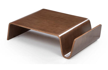 The Milford Modern Walnut Coffee Table features a plateau-like design that curves upward on the side and functions as magazine rack in sheer Walnut veneer finished plywood. This modern coffee table requires no assembly.