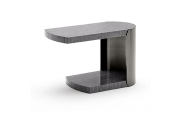 Cocktail sofa table in Madagascar figured Mowingui veneer in high gloss polyester finish. Curved leg in satin black