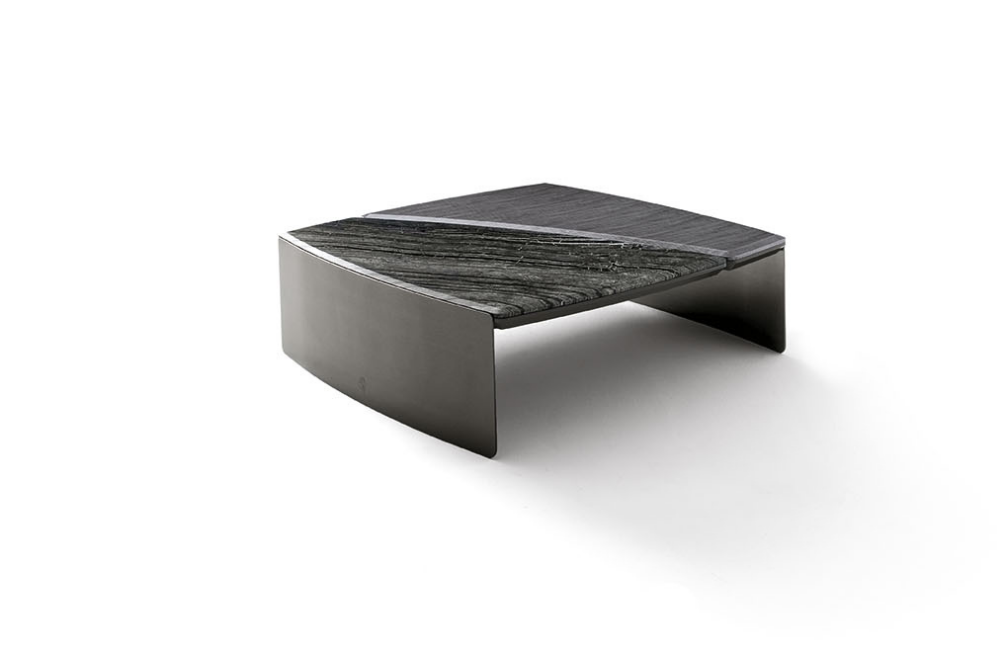 Square cocktail table with top in combination of Black Kenya marble and Madagascar fìgured Mowingui veneer in