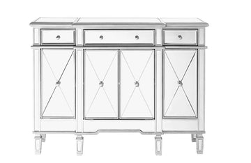 This fashionable, contemporary Mirrored console, with its hand-rubbed silver finish and incised carved, tapered legs, features a slight antique touch. Its alluring symmetry, size and shape make this piece perfect to magnify the beauty of your living room or add a touch of elegant decor to a hallway or narrow space. In addition, this attractive Mirrored cabinet offers you extra storage space and a wide display area for your art objects, figurines or candle holders. (Constructed with selected kiln-dried solid wood and engineered wood panels.)