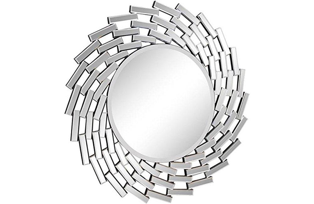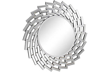 This stunning contemporary round mirror features a beautifully symmetrical "frieze" pattern made of reflective rectangles to enhance any wall of your home or office! the central Clear mirror and all mirror pieces are expertly cut with beveled edges. A truly radiant beauty! round with symmetrical rectangles design Clear mirror mirror and all surrounding panels are made with beveled edges open space design MDF panel backing overall measurements: 42" diameter x 1 inch deep center mirror: 24.6 inch diameter product weight: 33 lbs.