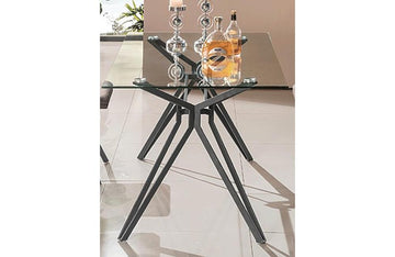 Clean angled lines on the base provide an ultra modern look while the clear glass top completes the look. The base of the table is finished in black matte metal. The