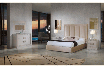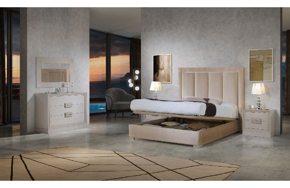 Elegance become the primary elements of the living. The Monica Bedroom set boasts of a terrific finish and stands testimony to the craftsmanship and precision that went into its making. If you are looking for an bedroom group that spells elegance and sophistication then this should be your ultimate choice. Make this a part of Your Home and you will surely be amazed at the way it changes the entire look and feel of your living room. Simply designed modern Monica Bed-group fits in well with both classical and traditional interior designs. Headboard Upholstered with Microfiber. Wood veneer (a thin layer of solid wood) covered with semigloss acrylic lacquer. Strongest Available, "Anti-Scratch", Repairable. 100% made in Spain. This Attractive Monica Bedroom set will instantly enliven any designed bedroom area. Modern linear surfaces design an atmosphere dominated by a perfect combination of style and simplicity dedicated to those who want to create around themselves an essential, elegant and functional home and for a style that is always aimed at a free dialogue with the surrounding space.